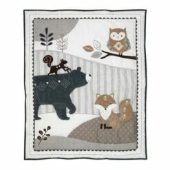 This five-piece nursery crib bedding set includes one quilt (36โ X 45โ), one breathable 100% cotton fitted crib sheet (28โ X 52โ), one crib skirt, one wearable blanket, and a complete set of wall decals. Start teaching your child from a young age about protecting the endangered animals throughout the world with this socially responsible crib bedding set. A portion of the proceeds from the purchase of this set will go to support causes focused on helping endangered animals. The quilt features โWild for Wildlifeโ embroidered in the center of a gray globe. A variety of protected animals are expertly appliqued and embroidered around the globe on the quilt. Included is a black and white panda bear, a textured elephant with gray minky ears, a yellow bobcat appliqued in curly boucle with black embroidered spots, a gray sea lion, a red panda with brown rings on his tail, a colorful sea turtle, and a pair of happy little penguins. A gray and white houndstooth flange separates the quilt from the gray border. The breathable 100% cotton fitted crib sheet features a variety of these rare animals. The fitted crib sheet has elastic all the way around ensuring a safe and secure fit on a standard crib mattress measuring 28โ x 52โ. The crib skirt is a gray and white houndstooth pattern with a white flange and finishes in a gray twill fabric, it has a 14.5โ drop. Included in this bedding set is a 100% cotton interlock wearable blanket that is recommended for safe sleep for babies. It is approximately 27โ long and is made in a soft heather gray. There is a light blue globe appliqued with the words Wild for Wildlife embroidered. Wall decals are a great way to make a feature wall in your childโs room. There are 3 peel and stick sheets which include a blue and gray globe that is 14โ in diameter and says โWild for Wildlifeโ in the center. Surrounding the globe are all the protected animals. These are easy to apply, create the look of a mural, and will not harm your walls.