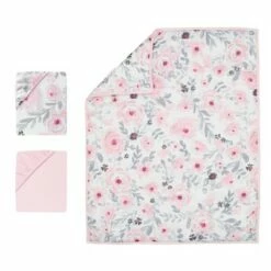 - Five-piece nursery bedding set includes one quilt, one 100% cotton fitted crib sheet, one crib skirt, one wearable blanket, and a complete set of wall decals.