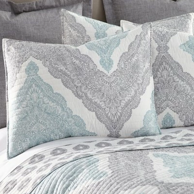 The Montclair Reversible Quilt Set by Levtex Home is inspired by traditional tiling designs. Offered in soft shades of teal and grey, this design will immediately transform your bedroom. Made with the softest lightweight cotton, this reversible quilt features a detailed diamond medallion design on the one side, reversing to ornate mini medallions on the other. The Quilt Set is machine washable and includes the quilt and matching pillow shams. Enjoy this for years to come!
