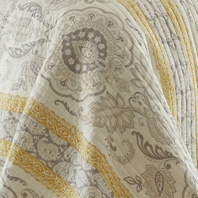 The St. Claire Reversible Quilt Set by Levtex Home is inspired by traditional suzani patterns. This modern, traditional suzani design will immediately transform your bedroom. Made with the softest lightweight cotton, this reversible quilt features a grey suzani and yellow paisley pattern, reversing to yellow paisley icons on the other. The Quilt Set is machine washable and includes the quilt and matching pillow shams. Enjoy this for years to come!