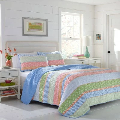 Indulge your bohemian side with this energized new take on classic patchwork quilts. Horizontal bands of mini print patterns in a fresh palette of pink, orange, lime, and chambray blue on white set a cheerful mood and the soft cotton fabric is pre-washed for added comfort. The quilt reverses to solid chambray blue which also trims the edges of the quilt and shams for a clean, tailored finish.