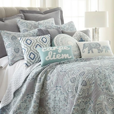 - LEVTEX TANIA QUILT BED SET: A intricate grey, teal, and white medallion pattern bedding set consisting of a quilt and matching pillow shams.Β Used by itself, as a layering piece or as a bedspread, this bedding set is extremely versatile.