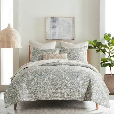 The Assisi Reversible Quilt Set by Levtex Home is inspired by antique European wallcoverings and tapestries. Offered in classic mint, blue, taupe and cream, this design will immediately transform your bedroom. This reversible quilt features a rich collection of beautiful regal floral on the front, reversing to a small clover outlines in taupe on cream on the back. The quilt and sham have a cotton front and cotton back, filled with a cotton-rich filler, and are machine washable. Enjoy this for years to come!
