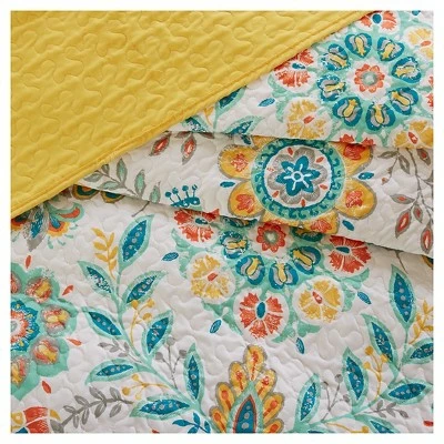 Update your bedroom with the warm and bright charm of the Eva Reversible Coverlet Set. The soft microfiber coverlet features a floral medallion and bird print in vivid colors with a solid reverse, for a pleasant boho look. The 2 matching shams (1 in Twin/TwinXL) pair perfectly with the motif of coverlet to create a welcoming and colorful aesthetic. For the finishing touches, 2 decorative pillows coordinate with the top of the bed to complete the ensemble. This boho coverlet set also uses an antimicrobial treatment that provides built-in freshness protection, reducing the growth of odor causing bacteria to keep fabric lasting longer.