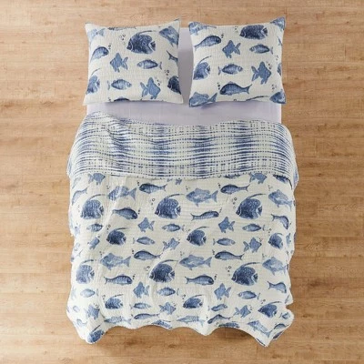 The Pataya Reversible Quilt Set by Levtex Home is inspired by the Greek islands. This fresh coastal design will immediately transform your bedroom. Made with the softest lightweight cotton, this reversible quilt features a painterly fish in indigo on a cream ground, reversing to a batick-inspired stripe in indigo on cream on the other. The Quilt Set is machine washable and includes the quilt and standard pillow shams. Enjoy this for years to come!