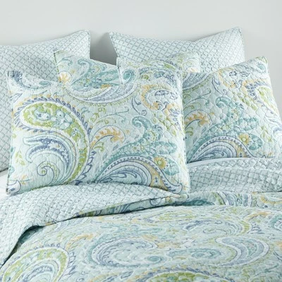 - LEVTEX CORTONA PAISLEY QUILT BED SET: A intricate green, yellow, blue, and white paisley bedding set consisting of a quilt and matching pillow shams.Β Used by itself, as a layering piece or as a bedspread, this bedding set is extremely versatile.