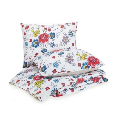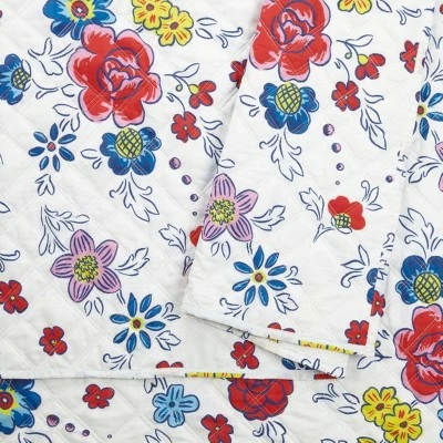 Transform any space into a tranquil contemporary setting with this whimsical look and feel of Flower Patch quilt set from Molly Hatch by Makerβs Collective. Cheerful floral motifs in shades of red, pink, blue and yellow will brighten and inspire your day. Completely reversible, this quilt is made of 100% polyester. Double diamond stitch quilting secures the quilt and sham. Extra value binding runs all four sides of the quilt and sham for long lasting quality.
