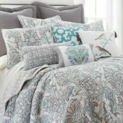 - LEVTEX LEGACY QUILT BED SET: A intricate grey and teal paisley bedding set consisting of a quilt and matching pillow shams. Used by itself, as a layering piece or as a bedspread, this bedding set is extremely versatile.