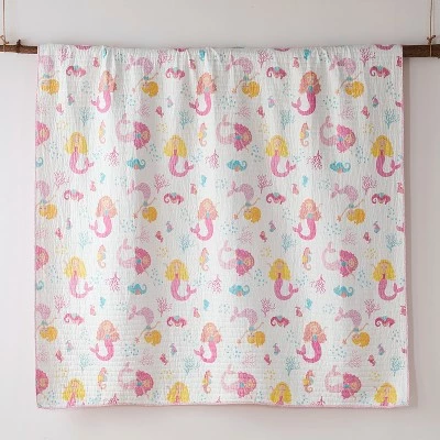 - THE MARINA DESIGN: One of our most popular quilt sets, Marina is inspired by childrens stories of mermaids. The front features a tossed pattern of colorful mermaids, seahorses, fish and coral on a white ground and reverses to a simple pink and white dotted pattern. A bound border provides contrast and texture to complete the look.