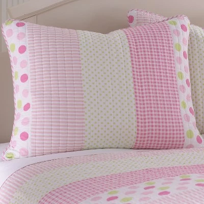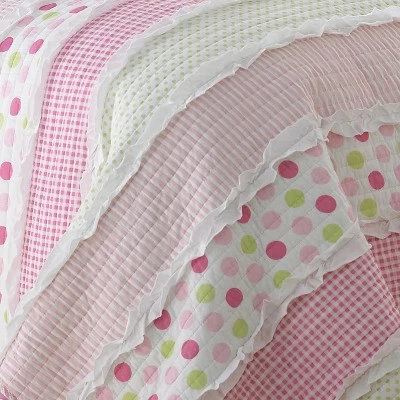 - THE MARLEY RUCHE DESIGN: One of our most popular quilt sets, Marley Ruche is inspired by sweet bedtime stories. The front features a fun mix of striped, gingham, and dotted patterns ruched together with dimensional white fabric, and reverses to a simple striped pattern in pink, white, and green. A bound border provides contrast and texture to complete the look.