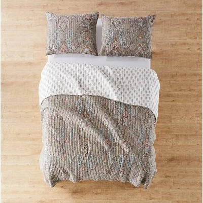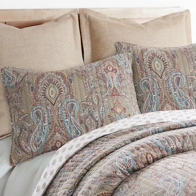 The Presidio Reversible Quilt Set by Levtex Home is inspired by antique European wallcoverings and tapestries. Offered in classic brown, red and taupe, this design will immediately transform your bedroom. This reversible quilt features a rich collection of medallions and paisleys on the front, reversing to small taupe medallion icons on white on the back.