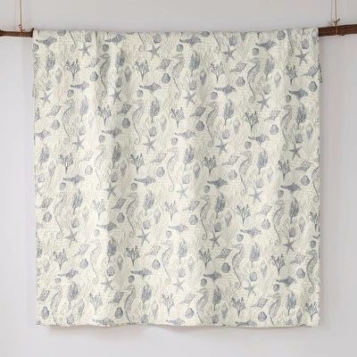 The Tahiti Reversible Quilt Set by Levtex Home is inspired by a snorkeling trip on a gorgeous coral reef. This intricate coastal design will immediately transform your bedroom. Made with the softest lightweight cotton, this reversible quilt features a seahorses, shell and coral in shades of grey and blue on a white ground, reversing to a blue and white stripe on the other. Enjoy this for years to come!