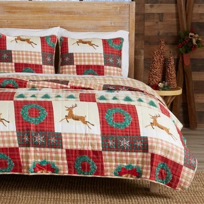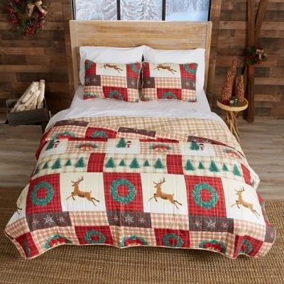 Deep reds, forest greens, and prancing deer enhance the holiday cheer our Holiday Homestead Quilt Set adds to any bedroom or guestroom. The cozy and warm essence of this microfiber quilt will have you drifting off to dreamland in no time. Our 3-piece Holiday Homestead quilt is perfect for the holiday season with its cotton-blend fill, your guests will be wrapped up in comfort and the holiday spirit. Experience the holidays like never before in our soft and cozy quilt.