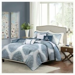 The Fairbanks 6 Piece Reversible Coverlet Set provides a modern take on the coastal stripe. It’s watercolor motif, accented with shades of white and blue, provides the calming feel of the ocean in your space. Three decorative pillows use embroidered seashells and fabric manipulation to pull this look together. If youโre not satisfied with any Target Owned Brand item, return it within one year with a receipt for an exchange or a refund.