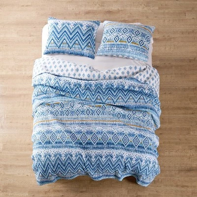 - THE AQUATAINE DESIGN: One of our most popular quilt sets, Aquataine is inspired by tie-dye techniques and patterns, with an an overall stripe created from tie dye elements front and a charming reverse pattern of blue medallion. A bound border provides contrast and texture to complete the look.