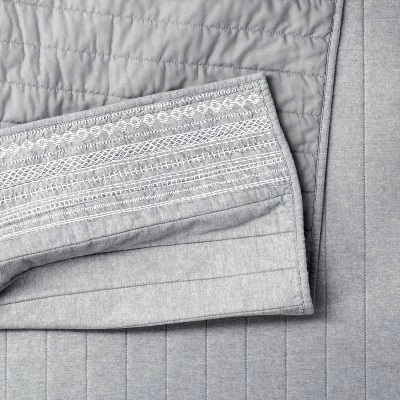 - Embroidered chambray quilt adds texture to your space