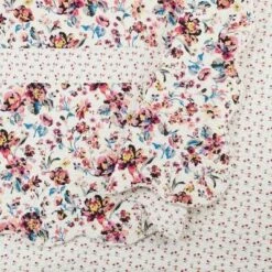 Update your bedding ensemble with the Breezy Floral cotton quilt set from Laura Ashley. This romantic garden floral creates a vintage mood in a soft palette of rose pink and dove gray with pale yellow accents on a creamy white background. The polka dot reverse print adds an additional feminine touch in pale pink and white, and also accents the edges of the quilt. This all-cotton quilt set is prewashed for extra softness and comfort. Layer this quilt set with a new Laura Ashley cotton sheet set for a more complete bedroom look. Set is machine washable for easy care. Twin quilt set includes: one quilt (88″l x 68″w) and one standard sham (21″l x 27″w). Full/queen quilt set includes: one quilt (90″l x 90″w) and two standard shams (21″l x 27″w). King quilt set includes: one quilt (96″l x 104″w) and two king shams (21″l x 37″w).