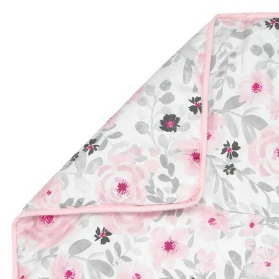 Welcome home your little girl with this charming watercolor floral 3-piece crib bedding set which includes one quilt/comforter, one crib skirt, and one floral fitted crib sheet. A gorgeous floral watercolor print decorates the quilt and fitted crib sheet in shades of pinks and grays. The solid pink crib skirt is shirred and has a 10โ drop. This eco-friendly nursery collection has been digitally printed in a high-resolution microfiber which enhances the pink and gray colors. Designed to fit a standard size crib measuring 52″ x 28″.