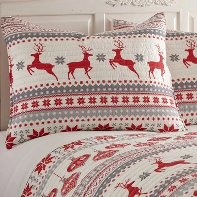 The Silent Night Reversible Quilt Set by Levtex Home is inspired by cozy fair isle sweater knits. Offered in grey, red and white, this design will immediately transform your bedroom. Made with the softest pre-washed cotton, this reversible quilt features a print of deer, ornaments and snowflakes in rows, reversing to snowflake medallion on the other. The Quilt Set is machine washable and includes the quilt and pillow shams. Bring the holidays home!