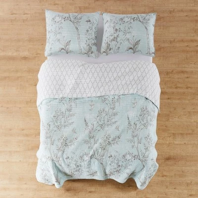 The Cozette Reversible Quilt Set by Levtex Home is inspired by vintage French wall coverings. This toile-like botanical design will immediately transform your bedroom. Made with the softest lightweight cotton, this reversible quilt features a etched trees and birds delicately rendeed in brown on a spa and cream ground, reversing to a spa trellis pattern on the other. The Quilt Set is machine washable and includes the quilt and standard pillow shams. Enjoy this for years to come!