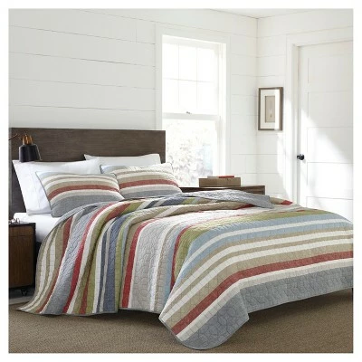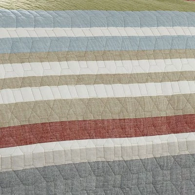 A boldly scaled multicolor stripe makes a big impact in a mixed neutral palette of khaki and grays on ivory with bright accents of scarlet, denim blue, and olive green. The colorful palette is softened with an overall chambray texture within the print that creates a casual attitude and a relaxed, cozy appeal. The all cotton quilt set is pre-washed for extra softness and comfort. The quilt reverses to a slate gray printed chambray texture that also trims the edges of the quilt and shams for a clean, tailored finish.