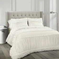You will sleep like a baby when you add this amazingly soft Nova Ruffle 3 Piece Comforter Set to your bed. Beautiful ruffles and ruching detail give it an incredible textured look. This Nova Ruffle 3 Piece Comforter Set is ideal for a master or guest bedroom in just about any home decor theme. Whether you love shabby chic, traditional, modern or cottage style home decor, this set can fit right in with any of those. The stripes of ruffles on the comforter and the pillow shams create a whole new dimension to the bedroom. The texture of the Nova Ruffle 3 Piece Comforter Set has a calming effect, adding a touch of elegance with its ruching and ruffles. The Nova Ruffle 3 Piece Comforter Set includes a soft and luxurious 230 GSM comforter and two matching pillow shams. It is available in both King and Full/Queen sizes in off white. Due to the delicate nature of the frilly ruffles, this Nova Ruffle 3 Piece Comforter Set is labeled as dry clean only. Part of the Nova Ruffle Collection. Oeko-Tex Certified.