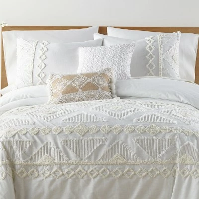 The Harleson Comforter Set by Levtex Home is hip, dimensional and contemporary.Β Offered in cream and white, this design will immediately transform your bedroom.Β Made with the softest lightweight cotton, this comforter set features a an intricate tribal jacquard in cream tufted chenille and frayed cotton on a white cotton ground. It has a tufted and frayed cream tribal pattern on white on the front and a solid cream 100% cotton on the reverse.Β It is filled with a hypoallergenic 100% polyester filler. The Harleson Comforter Set is machine washable and includes the comforter and matching pillow sham cases.Β Enjoy this for years to come!