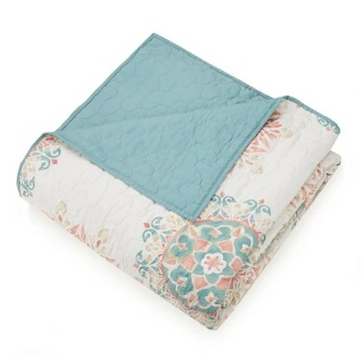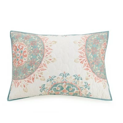 An oversized suzani inspired pattern brings a colorfully bold look to the bedroom in shades of coral, blue and greens. Reverses to a solid soft teal back. The Jessica Simpson Pompeii Medallion quilt set is prewashed for extra softness and includes a quilt and 2 pillow shams. The quilt and shams are machine washable.