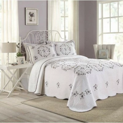 Bring home a taste of the country with the Modern Heirloom Gwen bedspread. Adorned with delicate floral motifs, this is a sweet and elegant addition to any bedroom. 100% cotton face and fill with a brushed polyester backing. Matching pillow shams sold separately. Machine wash in cold water, gentle cycle. Do not use bleach. Tumble dry, low heat. Use large capacity machine as needed.