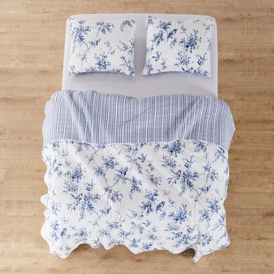 The Avellino Grey Reversible Quilt Set by Levtex Home is inspired by classic French toile de jouy. This bird toile design will immediately transform your bedroom. This reversible quilt set is made with the softest lightweight cotton that will never feel stiff or heavy. This quilt features beautifully rendered birds and floral in a classic toile style, reversing to a charcoal and white stripe on the other. Enjoy this for years to come!