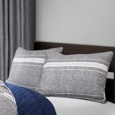 Neutral gray and stylish texture printed stripes come together in this Marlton Stripe Quilt 3 Piece Set. The design is printed on 100% cotton. The reverse side of the quilt features a solid color with quilting details on the back. This Marlton Stripe Quilt 3 Piece Set is ideal for teens and young adults, as well as for guest bedrooms, first apartments and dorm rooms. Being reversible, the Marlton Stripe Quilt 3 Piece Set gives you flexibility with your bedroom design. If you ever decide to change the look of your room, you can simply turn the quilt and shams over. The Marlton Stripe Quilt 3 Piece Set includes a soft reversible cotton quilt and two matching pillow shams, which give this set a complete look right out of the package. This set is available in both full/queen and king sizes. This set is safe to machine wash on the gentle cycle and to tumble dry on low. Please refer to the labels on the product for full care instructions. Part of the Marlton Stripe Collection.