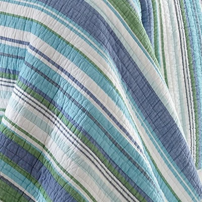 The Vero Reversible Quilt Set by Levtex Home is inspired by the colors of the ocean. Offered in shades of teal, blue, green and cream, this design will immediately transform your bedroom. Made with the softest lightweight cotton, this reversible quilt features a printed stripe in blues and greens on the one side, reversing to a modern Swedish-inspired fish print on the other. The Quilt Set has a cotton rich filler (90% cotton, 7% rayon, 3% other fibers) and is machine washable. Enjoy this for years to come!