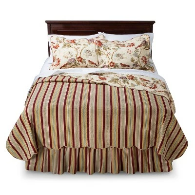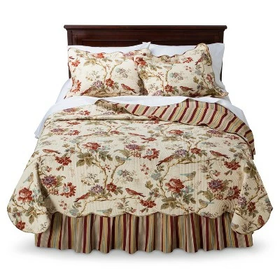 The Charleston Chirp bedding collection is a perfect example of Waverly’s old-world tradition, classic styling, and clean, contemporary fashion. The bedding design features branches of roses, tulips and dianthus, with beautifully placed wrens accented in a gentle palette of papaya, sage green, orange rust, eggshell blue and lavender on a soft vanilla ground. The all-over nature print is further enhanced by vertical stitched quilting and finished with a coordinating self-piping decorative trim to match the stripe reverse. Versatile, stripe to floral reversible quilt allows you to change your look in seconds for the perfect bedroom retreat. Coordinating reversible shams and vertical stripe bed skirt are included in the quilt set. Quilted shams feature a 3″ scalloped flange with stripe accent self-piping. Standard sham measures 21″ x 26″. King sham measures 21″ x 36″. Bed skirt offers a 15″ drop. Coordinating, decorative quilted 20″ square pillow sold separately. Quilt set and coordinating accessories are 100% cotton fabric with cotton fill. Valance, decorative quilted pillow and curtain panels sold separately. Imported.