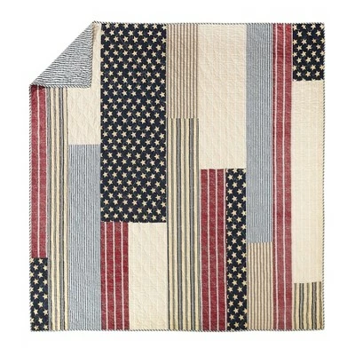 A festive parade of stripes with a sprinkling of stars in patchwork piecing make this quilt a true americana look. Deep navy, true blue, and red feature in these textured class prints. This easy cozy quilt is all 100% cotton. Irregular piecing adds to the comfortable vintage homemade feel. The quilt reverses to a print of blue stripes. A set of matching shams complete this charming bed.