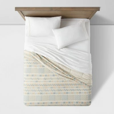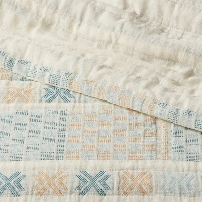 Attractive and comfortable, the Jacquard Gauze Quilt from Threshold™ makes the perfect addition to your bedroom. This off-white quilt is adorned with a geometrical jacquard pattern in light-blue and yellow shades on a gauze background to lend a soft and cozy touch of texture to the top of your bed. The midweight quilt is made of a soft cotton-bend fabric and backing for comfortable year-round use, and is machine washable for easy care. Pair with matching shams and a white sheet to complete your bedding ensemble.