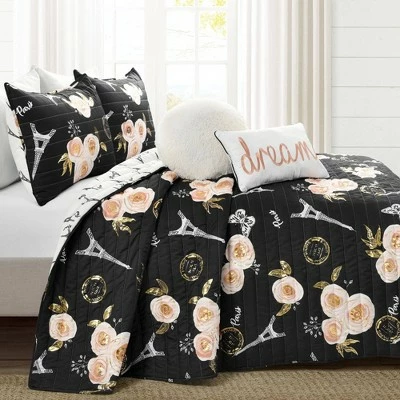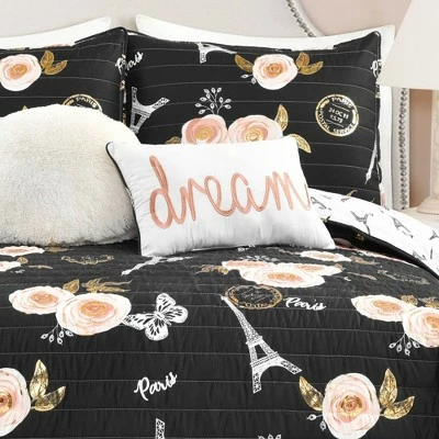 You will love this soft reversible Vintage Paris Rose Butterfly Script Quilt Set, which features a unique and elegant pattern of roses, butterflies and Eiffel Towers with the word Paris in script font on the front. The beautiful vintage look with modern metallic printing detail will take your breath away. The reverse side of this Vintage Paris Rose Butterfly Script Quilt Set features the Eiffel Towers and the word Paris engineer printed against a white background. This gives you two great looks in one set. When you’re ready for a change, simply turn the quilt and shams over to the other side and you have a whole new look. This side with its more subtle print is ideal for layering. Because it’s reversible, the look of this Vintage Paris Rose Butterfly Script Quilt Set is so versatile that you can use it in a tween’s bedroom, young adult’s bedroom, guest bedroom, master bedroom or even a college dorm room. Anyone who dreams of visiting Paris or enjoys romantic French culture will surely adore this set. The Vintage Paris Rose Butterfly Script Quilt Set is available in three sizes. The Twin-XL size is a 4-piece set which includes the quilt, matching pillow sham and two decorative throw pillows. The Full/Queen and King sizes are 5-piece sets which include the quilt, two matching pillow shams and two decorative pillows. This set gives you a complete look for your bed right out of the package. The rectangular decorative pillow features the word Dream embroidered on the front with unique trim detail. The circular decorative pillow is an off-white faux fur pillow for added texture and coziness. For your convenience, the quilt and pillow shams in this Vintage Paris Rose Butterfly Script Quilt Set are safe to machine wash and tumble dry. However, the decorative pillows should be spot cleaned only. Part of the Vintage Paris Rose Collection.