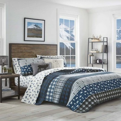 Wide horizontal bands of signature plaids and novelty winter-themed prints mix together in a cool and inviting palette of blue tones with carbon gray accents. The soft, pre-washed cotton quilt reverses to a deep tone blue and gray plaid that also trims the edges of the quilt and standard shams. Channel quilted for added warmth and comfort, this quilt set has both style and practicality. Twin quilt set includes: one twin quilt (88″l x 68″w) and one standard sham (21″l x 27″w), full/queen quilt set includes: one full/queen (90″l x 90″w) and two standard shams (21″l x 27″w), king quilt set includes: one king quilt (96″l x 104″w) and two king shams (21″l x 37″w)