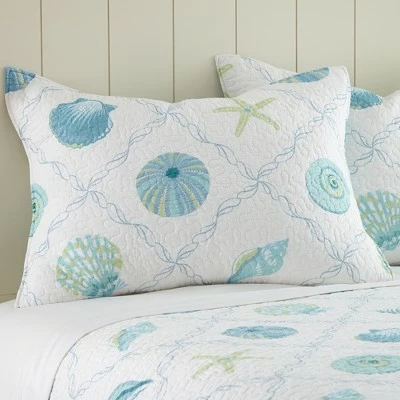 - THE MARINE DREAM SEAGLASS DESIGN: One of our most popular quilt sets, Marine Dream Seaglass is inspired by evening walks on the beach. It features blue and green seashells and starfish tossed in a wavy lattuce pattern on white ground and a charming reverse pattern of matching stripes. A bound border provides contrast and texture to complete the look. The matching shams are randomly cut from the same fabric as the quilt, making each sham unique and not identical to any other sham.