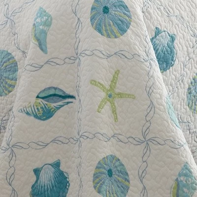 The Marine Dream Seaglass Reversible Twin Quilt Set by Levtex Home is inspired by evening walks on the beach. This colorful seashell design will immediately transform your bedroom. Made with the softest lightweight cotton, this reversible quilt features blue and green seashells and starfish tossed in a wavy lattuce pattern on white ground, reversing to a matching stripes on the other. The Twin Quilt Set is machine washable and includes the quilt (68x86in.) and one standard pillow sham (26x20in.) Enjoy this for years to come!