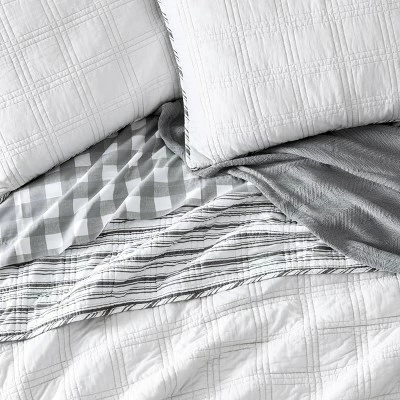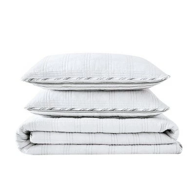 The Eddie Bauer Lake Crescent collection is an essential layering piece for year-round comfort. Fully reversible for versatility. Solid white reverses to a bold but livable charcoal stripe print. Made from 100% cotton and pre-washed, the quilt set is breathable, durable, and soft. Filled with a blend of 80% cotton and 20% polyester, Eddie Bauer quilts are lightweight but warm. Shams are included to round out the ensemble. (one sham included with twin size) rounded corners and unique quilt stitch are the details you would expect from Eddie Bauer. Packaged thoughtfully without plastic. Machine washable for easy care.