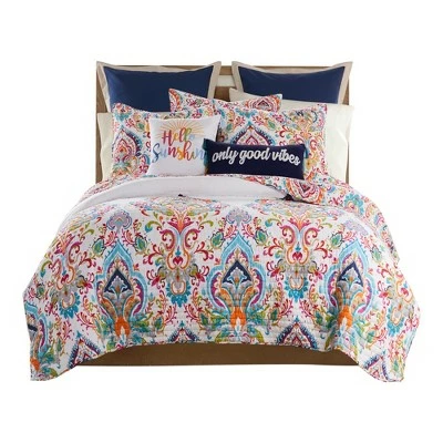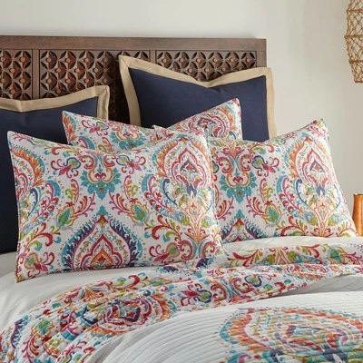 The Formosa Reversible Quilt Set by Levtex Home is inspired by the intricate patterns in woven scarves. Offered in cream, teal, orange and fuchsia, this design will immediately transform your bedroom. This reversible quilt features oversized medallions ascending from the bottom of the quilt in vibrant colors on a cream gound on the front, reversing to a myriad of smaller medallions on the back. The Quilt and Sham have a cotton front and cotton back, filled with a cotton-rich filler, and are machine washable. Enjoy this for years to come!
