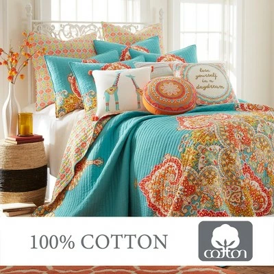 The Mariska Quilt Set by Levtex Home is inspired by the intricate patterning in bright woven scarves. Brightly-colored damasks in orange, yellow and red on a teal ground decorate the this uplifting Quilt Set. The quilt reverses to a kaleidoscope inspired medallion pattern in teal and orange. This machine-washable set is made from 100% pre-washed cotton. The set includes a reversible quilt, and comes with matching pillow shams.