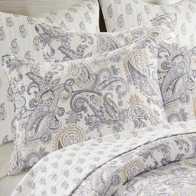 The Maribelle Reversible Quilt Set by Levtex Home is inspired by traditional woven European throws. This delicate paisley design will immediately transform your bedroom. Made with the softest lightweight cotton, this reversible quilt features a intiricate, playful paisley in charcoal, grey and taupe on a cream ground, reversing to a ditsy paisley in taupe and grey on cream on the other. The Quilt Set is machine washable and includes the quilt and standard pillow shams. Enjoy this for years to come!