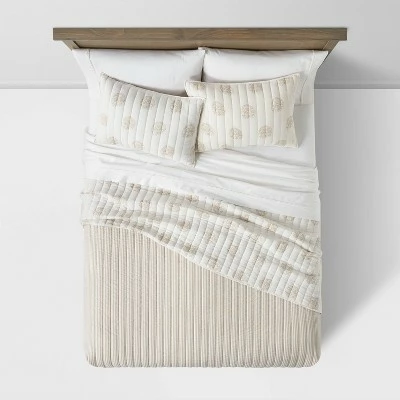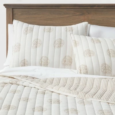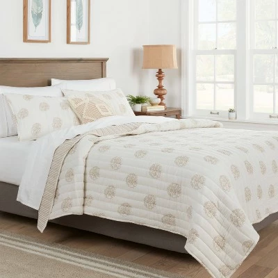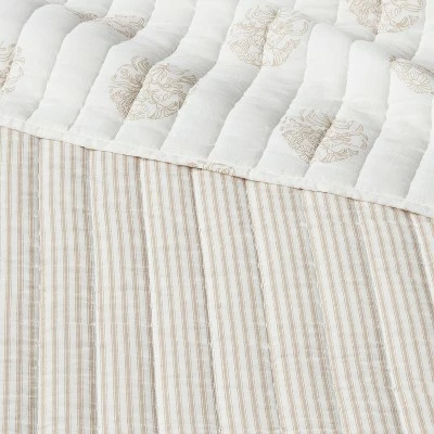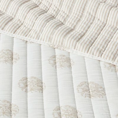 Add beautiful style to your sleep space with this Reversible Printed Voile Block Print Quilt from Threshold™. This beige and cream voile quilt printed with a floral block pattern brings dressy appeal to your bedding. It features a stitched quilted finish to lend a soft and cozy touch of texture to the top of your bed, along with a striped design on the reverse for a timeless look. This lightweight cotton quilt is complete with breathable cotton backing for comfortable year-round use, and is machine washable for easy care. Pair with matching shams and a sheet to coordinate your bedding ensemble.