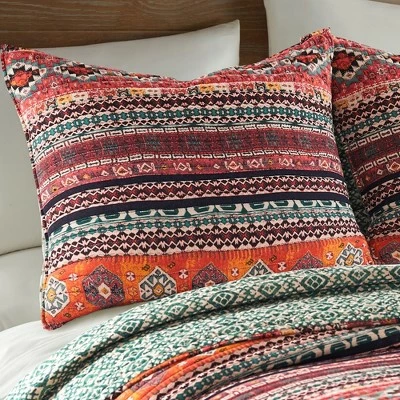 The Vista Reversible Twin Quilt Set by Levtex Home is inspired by traditional global rugs. Offered in shades of orange, green, red and black, this design will immediately transform your bedroom. Made with the softest lightweight rayon, this reversible quilt features an updated take on Southwest motifs from on the one side, reversing to a green stamped print in cotton on the other. The Twin Quilt Set has a cotton rich filler (90% cotton, 7% rayon, 3% other fibers) and is machine washable and includes the quilt (68x86in.) and one standard pillow sham (26x20in.) Enjoy this for years to come!