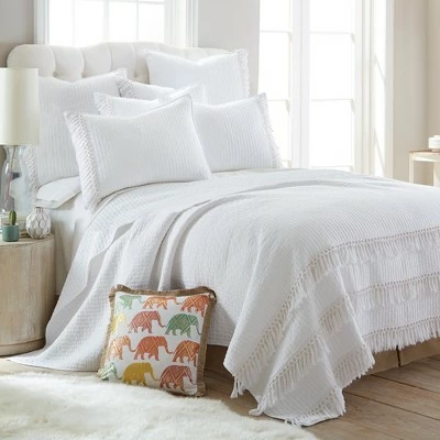 - LEVTEX CASITA WHITE QUILT BED SET: A simple white quilt with white fringe bedding set consisting of a Twin size quilt (68x86in.) and one matching pillow sham (26x20in.).Β Used by itself, as a layering piece or as a bedspread, this bedding set is extremely versatile.